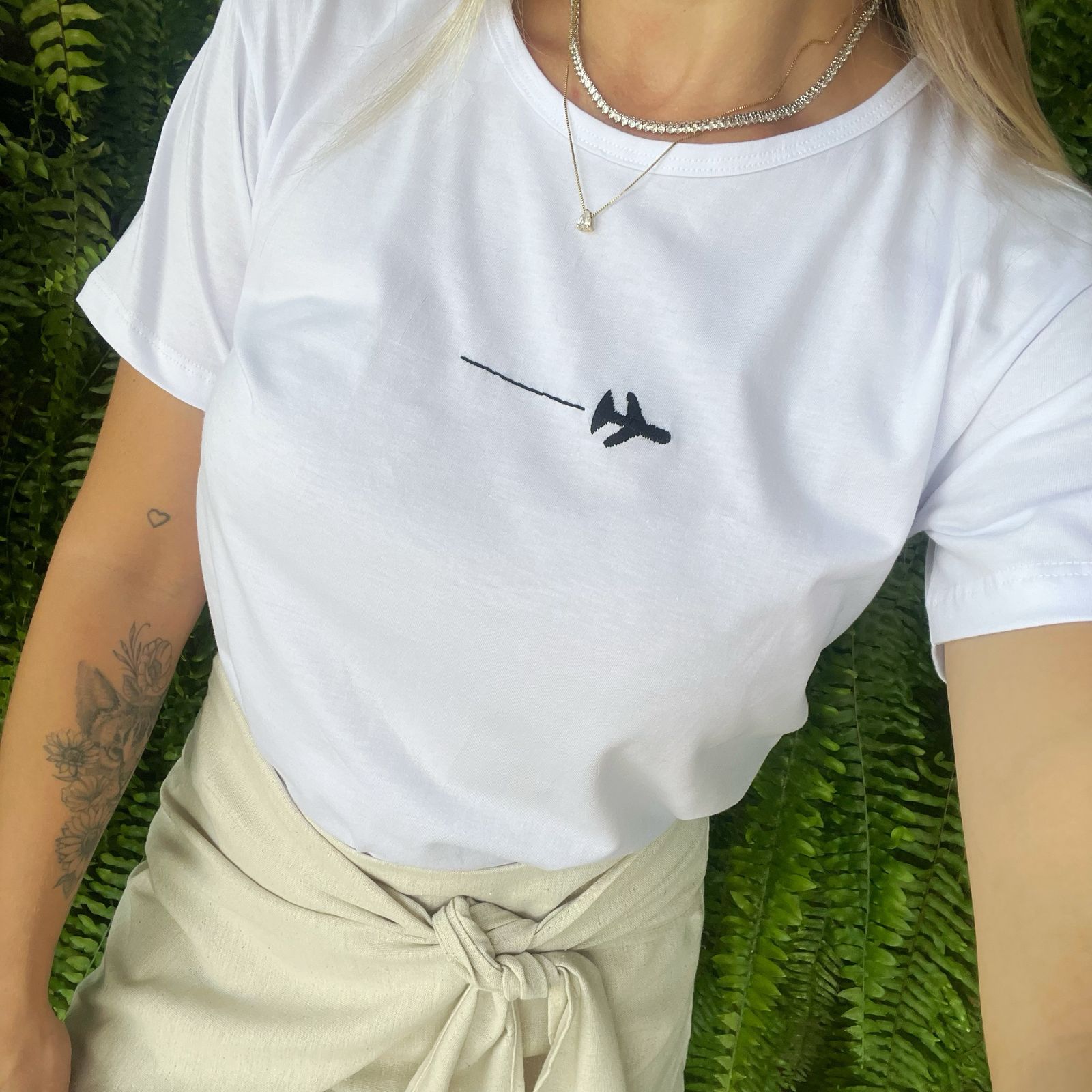Camiseta branca com bordado manual de um avião preto no centro da camiseta.